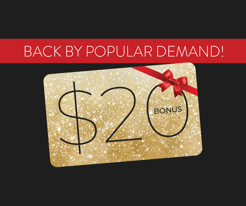 Receive a $20 Bonus for every $100 in Gift Cards purchased! Available while quantities last. Redeem your $20 Bonus from January 1st to March 31st, 2026.